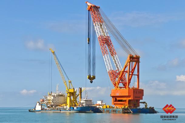 사진은 토토 스포츠 Hainan Dongfang 해상 풍력 발전 프로젝트의 단일 파일 기초 건설을 보여줍니다
