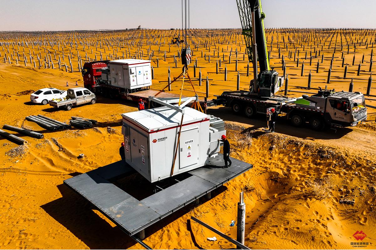 2024년 3월 22일, 닝샤 텅거 사막에 있는 "사거황" 신에너지 기지 중웨이 2단계 북쪽 지역에 있는 롱위안 전력의 100만 킬로와트 태양광 프로젝트가 박스형 변압기 호이스팅 작업을 수행하고 있습니다 베이스는 조립식 파일과 강철 플랫폼을 갖춘 새로운 유형의 박스형 변압기 기초를 사용합니다 이 박스형 변압기 기초는 사막의 일반 콘크리트 기초 건설의 어려움과 높은 비용을 효과적으로 해결하고 바람과 모래에 의한 박스형 변압기의 침식을 효과적으로 피할 수도 있습니다 사진: 장첸빈